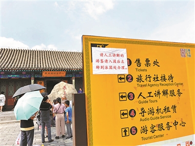 參團的游客被帶入恭王府景區(qū)后,原有的導(dǎo)游便不再講解,由恭王府內(nèi)的導(dǎo)游進行講解。在門口告示牌上,張貼有“請(需)人工講解的游客入園后左轉(zhuǎn)到派團處辦理”的字樣。同時,告示牌上寫著“景區(qū)內(nèi)嚴禁任何未經(jīng)批準的經(jīng)營活動,如個人或團體私自收費講解”。