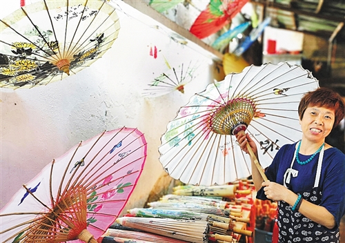 貴州省赤水市大同古鎮,油紙傘傳人李珍霞在展示她制作的油紙傘。大同古鎮歷史悠久,擁有“獨竹漂”、竹編、油紙傘等非物質文化遺產。 經濟日報-中國經濟網記者 周明陽攝