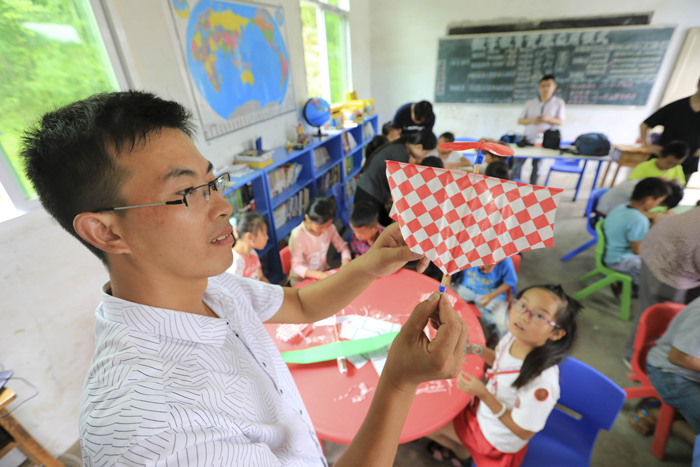 重慶彭水縣大壩村小學教師李大開在給學生們講解航空知識 劉潺/攝