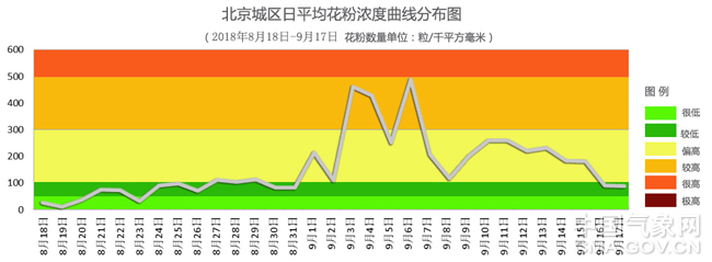 圖為北京城區近一個月日平均花粉濃度分布曲線。可以看到北京城區花粉濃度8月下旬一直處于較低水平,9月開始空氣中花粉濃度明顯升高,9月6日一度達到497粒/千平方毫米,9月16日開始,花粉濃度降到了較低水平。其中9月2日北京市出現了中雨天氣,從圖中也可以看出,市區花粉濃度出現了明顯下降。王美麗 制圖