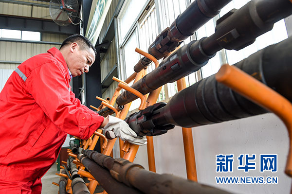 在中國石化江蘇油田工程技術服務中心,田明在檢查設備(10月9日攝)。新華社記者 李博 攝
