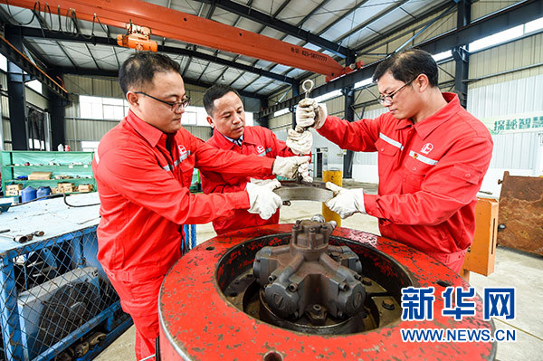 在中國石化江蘇油田工程技術服務中心,田明(中)與團隊工作人員在保養設備(10月9日攝)。新華社記者 李博 攝