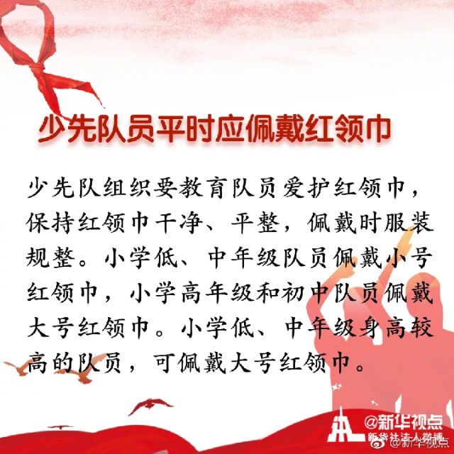 “我們是共產(chǎn)主義接班人,繼承革命先輩的光榮傳統(tǒng),愛祖國,愛人民,鮮艷的紅領(lǐng)巾飄揚在前胸。”紅領(lǐng)巾是紅旗的一角,是少年先鋒隊的象征與標志。你是幾歲佩戴上的紅領(lǐng)巾?你對曾經(jīng)朝夕相伴的紅領(lǐng)巾了解多少?戳圖看詳解↓↓