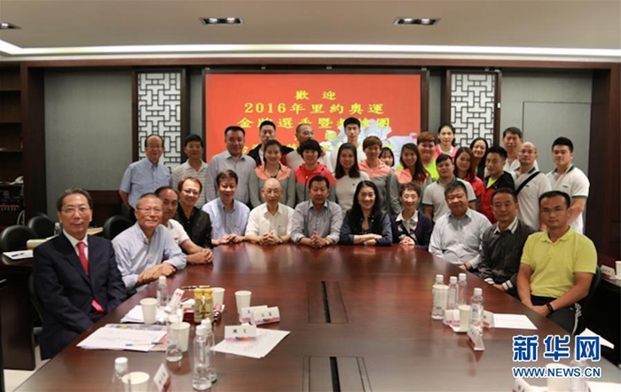 2016年,里約奧運(yùn)會(huì)大陸金牌選手和教練交流團(tuán)到“中華兩岸經(jīng)貿(mào)投資文化教育協(xié)會(huì)”座談交流時(shí)合影。協(xié)會(huì)由黃紫玉(前排右五)在2009年發(fā)起成立,成為兩岸民間交流的一個(gè)平臺(tái)(受訪者供圖)。 新華社發(fā)