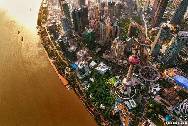 ↑無人機航拍上海沿江美景,江水被鍍上一層金黃。新華網(wǎng)發(fā) 王正坤 攝
