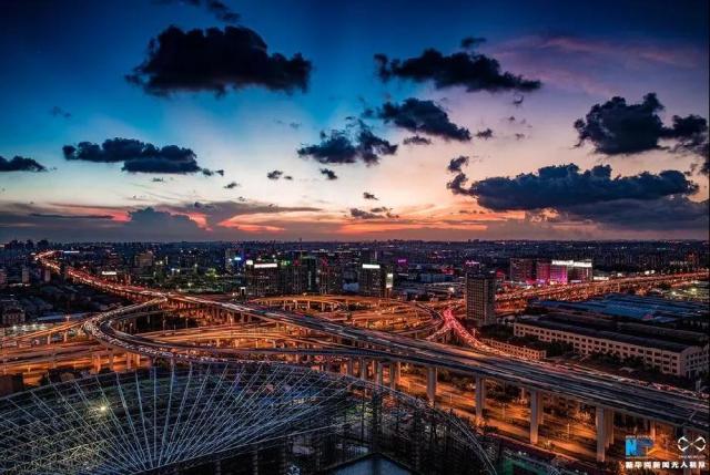 ↑傍晚時刻的上海立交橋。新華網(wǎng)發(fā) 田橫 攝
