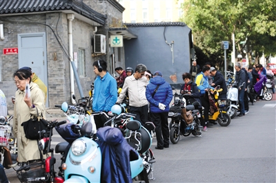 10月10日,西城交通支隊(duì)北區(qū)非機(jī)動(dòng)車(chē)登記站,市民“扎堆兒”等待給電動(dòng)自行車(chē)登記牌照。資料圖片/新京報(bào)記者 王貴彬 攝