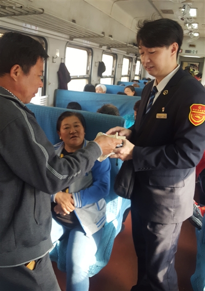目前,除了四個大站提供售票服務(wù)外,7053次經(jīng)過的其他20個小站都是上車補(bǔ)票。圖為列車員正在為乘客補(bǔ)票。