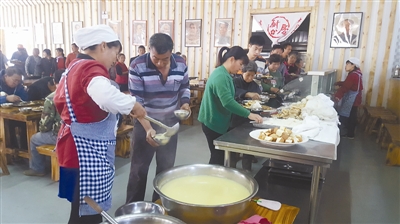 午飯時間,中郝峪村村民到大食堂免費(fèi)就餐。