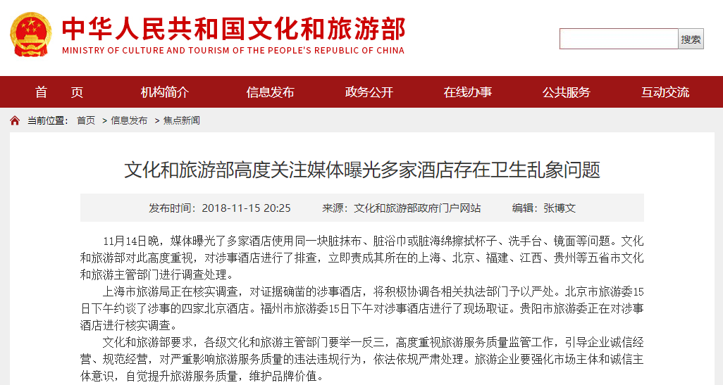 回應(yīng)稱,11月14日晚,媒體曝光了多家酒店使用同一塊臟抹布、臟浴巾或臟海綿擦拭杯子、洗手臺(tái)、鏡面等問題。文化和旅游部對(duì)此高度重視,對(duì)涉事酒店進(jìn)行了排查,立即責(zé)成其所在的上海、北京、福建、江西、貴州等五省市文化和旅游主管部門進(jìn)行調(diào)查處理。