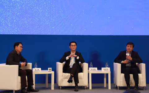 第五屆世界互聯網大會企業家高峰對話分論壇,高瓴資本張磊(左)、騰訊馬化騰(中)、百度李彥宏(右)