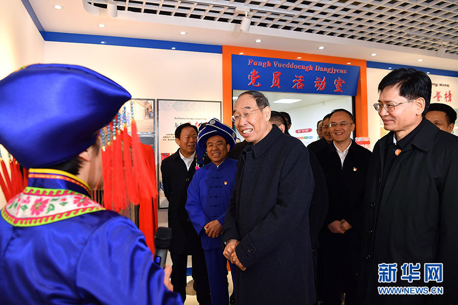 在港北區(qū)港城街道龍井村,尤權(quán)考察了村委辦公樓、便民服務大廳、壯族文化展館,聽取民族團結(jié)進步創(chuàng)建等情況介紹,與少數(shù)民族群眾親切交談,祝愿他們?nèi)兆右惶毂纫惶旌茫钤絹碓叫腋!?/p>