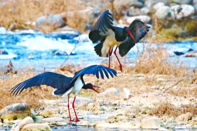 覓食時(shí),黑鸛多在淺灘中跋涉,吃飽后,還會(huì)在水邊休息一會(huì)兒。為了捕捉振翅飛翔的鏡頭,昨天一位穿黑色棉服戴深藍(lán)色帽子的拍鳥(niǎo)者竟然反復(fù)向黑鸛投石,石塊約有半塊磚大小。