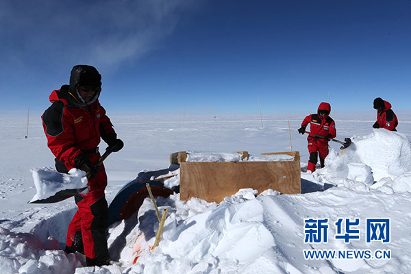 1月5日,科考隊(duì)員在清理昆侖站冰芯房外圍積雪。新華社記者 劉詩平 攝
