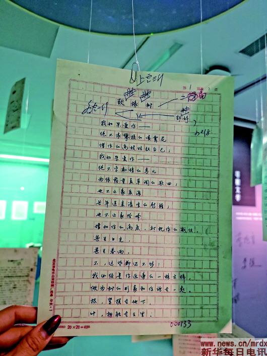 舒婷的詩歌代表作《致橡樹》就寫在42年前的兩頁“北京市電車公司印刷廠”印制的紅色格子稿紙上。如今它被串上線,懸掛在中國現(xiàn)代文學館的展廳中央。