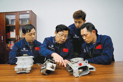 4月3日,王曙群(左二)給團(tuán)隊(duì)成員講解對(duì)接機(jī)構(gòu)組件的裝配要領(lǐng)。新華每日電訊記者張建松攝
