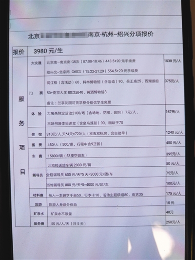 海淀區(qū)某中學(xué)則向家長公開了收費(fèi)明細(xì)。在家長王先生提供的游學(xué)清單上,記者看到5天的研學(xué)旅行費(fèi)用為3980元,游覽地點(diǎn)包括南京大屠殺遇難同胞紀(jì)念館、西湖和魯迅紀(jì)念館等。行程中還設(shè)置了眾多教育內(nèi)容,比如參加南京大學(xué)講座、著漢服行謝師禮、探究杭州西湖的光學(xué)現(xiàn)象等。