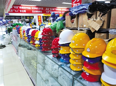 朝陽某大型建材市場內(nèi)有各價位的安全帽出售,商家稱10余元的需求大。新京報記者 張熙廷 攝