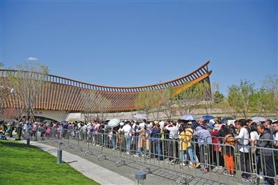 昨日,五一小長(zhǎng)假第一天,世園會(huì)迎來(lái)開(kāi)園后的首個(gè)客流高峰。圖為當(dāng)日下午三時(shí)許,中國(guó)館前排隊(duì)的游客。新京報(bào)記者 侯少卿 攝