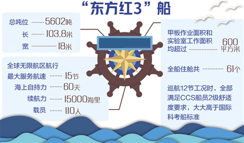 “東方紅3”船是一艘5000噸級新型深遠海綜合科學考察船,以培養深海大洋創新型人才為首要任務,融合科學研究、科學考察、高新技術研發應用為一體。該船總長103.8米、寬18米,海上自持力長達60天,可連續航行1.5萬海里;載員110人,甲板作業面積和實驗室工作面積均超過600平方米。該船是目前世界上最安靜,定員最多,經濟性、振動噪聲、電磁兼容等指標要求最高,作業甲板和實驗室面積利用率最大、綜合科考功能最完備的新一代海洋綜合科考船。
