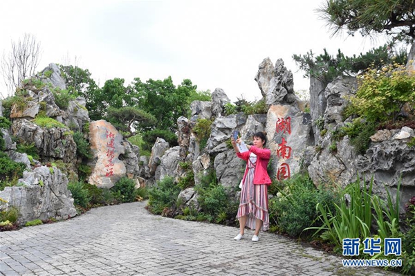 7月7日,游客在湖南園中參觀。當日,2019年中國北京世界園藝博覽會“湖南日”活動在北京世園會園區舉行。新華社發(任超 攝)