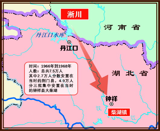 1967年丹江口大壩下閘蓄水。淅川縣是丹江口水庫重點(diǎn)淹沒區(qū)。從1966年到1968年,河南、湖北兩省共搬遷38萬人,淅川縣的移民占了20萬人。遷往湖北的淅川移民有7.5萬,其中,2.6萬人分散安置在當(dāng)時(shí)的荊門縣,4.9萬人集中安置在當(dāng)時(shí)的鐘祥縣大柴湖。