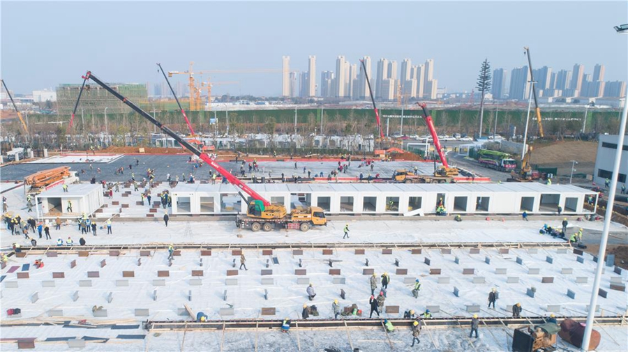 1月25日,由中國建筑中建三局牽頭建設的武漢火神山醫院正式開工,醫院總建筑面積3.39萬平方米。截至1月29日下午16時,火神山醫院項目現場場地平整和回填全部完成,板房基礎混凝土澆筑完成約90%,已經完成300多個箱式板房骨架安裝,同時場外正在抓緊板房拼裝,完成約400個,吊至現場可直接安裝。水電暖通、機電設備等材料全面到位,且同步開始作業。