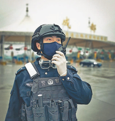 四川成都市青羊區(qū)公安分局民警楊桐今年28歲,新婚不久的他投入防疫一線,在高速公路收費站執(zhí)勤,每天平均盤查1000余臺車輛,為2600余人測量體溫。圖為2月12日,楊桐在崗位上通過對講機與同事溝通工作。本報記者 王明峰攝