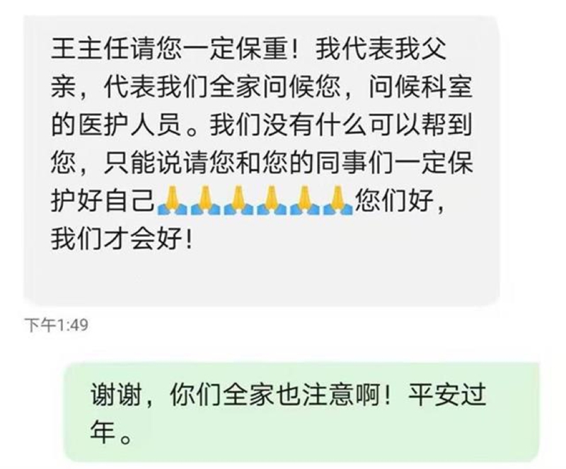 1月30日晚上10時許,武漢市中心醫院呼吸與危重癥醫學科副主任醫師王亮朝拖著疲憊的身子回到家里,意外收到了之前一位患者發過來的加油短信,簡單的幾句話,讓他感覺十分溫暖,充滿力量。