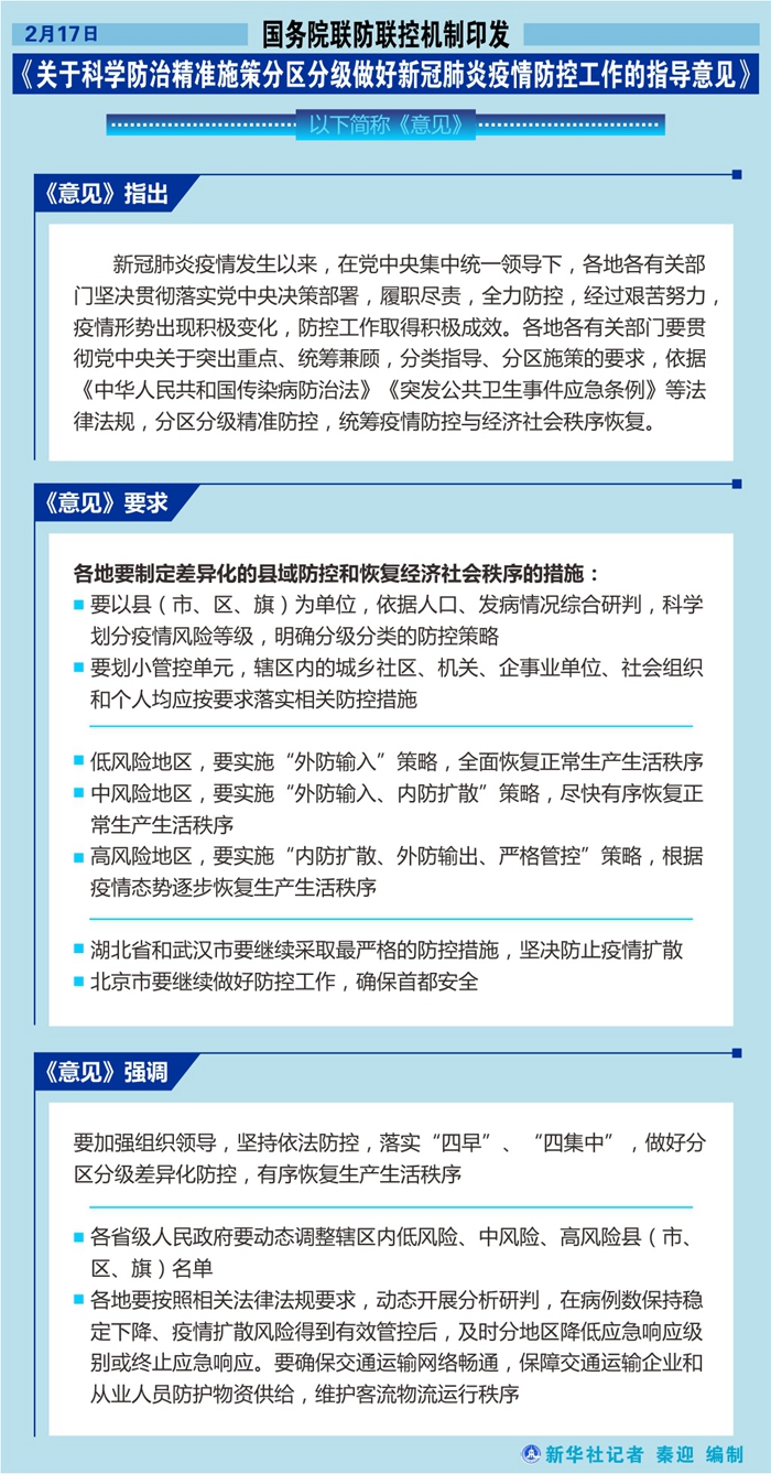 新華社北京2月18日電? 2月17日,國(guó)務(wù)院聯(lián)防聯(lián)控機(jī)制印發(fā)《關(guān)于科學(xué)防治精準(zhǔn)施策分區(qū)分級(jí)做好新冠肺炎疫情防控工作的指導(dǎo)意見(jiàn)》(以下簡(jiǎn)稱(chēng)《意見(jiàn)》)。
