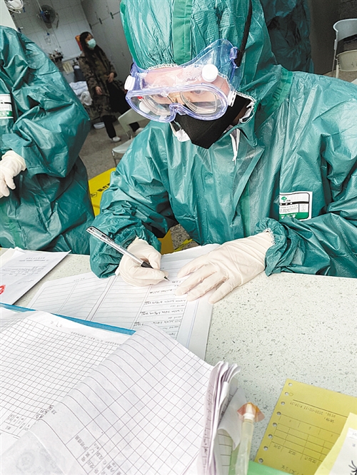 2月11日,賈娜重新穿上防護(hù)服,回到了急診科,每天在搶救室不停歇地為患者打針、補(bǔ)液、抽血、記錄、上呼吸機(jī)……