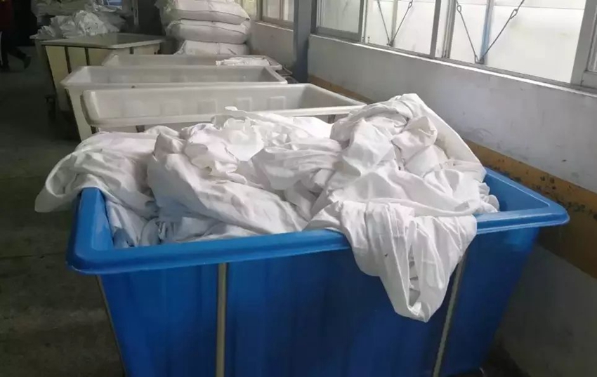 每趟列車到達終點站后,臥具都會重新更換,拆卸下的臥具由專人運送至洗滌消毒中心。被套、枕套、床單等分別放在不同的待洗推車里,工作人員會根據臥具的種類、污漬程度進行分揀。