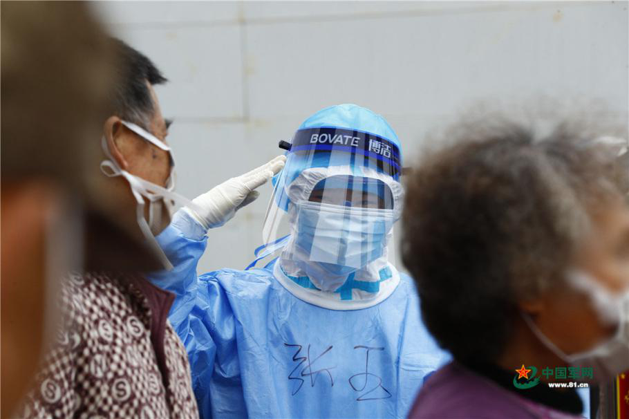 醫護人員向表達感謝的患者回敬軍禮。王皓宇 攝