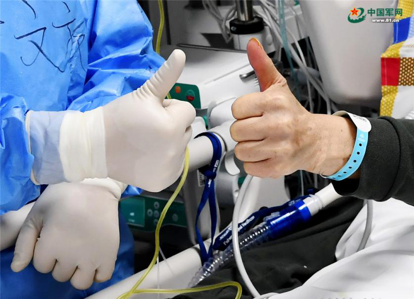 火神山醫院重癥醫學一科自2月10日開始收治重癥患者以來,全科醫護人員不畏風險全力救治,他們根據患者病情的變化,有預見性地快速調整救治方案,采取呼吸支持、抗病毒、維護臟器功能、加強營養等方法,使重癥患者逐漸有了好轉,提高了救治成功率。互相鼓勵點贊,是在重癥室看到最多的場景。解放軍報記者王傳順 攝