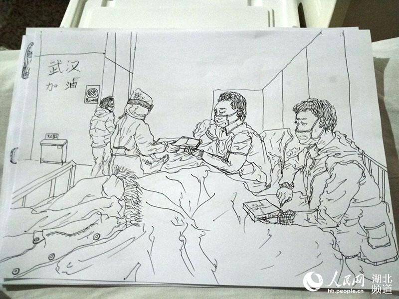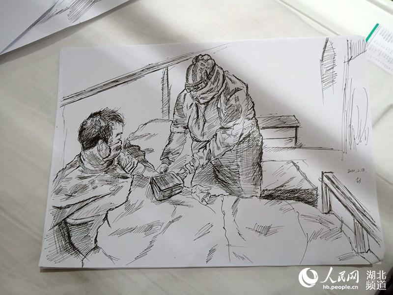 “被照顧得很好”的小彭常常看到醫護人員們穿著厚重的防護服,一忙就是6個小時以上不停歇,連水和飯都得換班以后吃,卻每天依然為患者提供無微不至的照顧。出于感動和感激,彭昕燁向醫護人員借了紙和筆,將方艙醫院溫暖的瞬間畫成素描。
