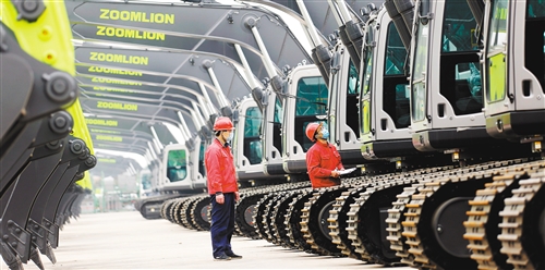 位于陜西省渭南高新區的中聯重科渭南工業園內,檢驗人員對即將出廠的挖掘機檢查驗收。崔正博攝(中經視覺)