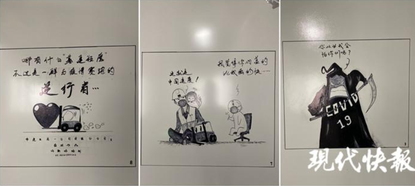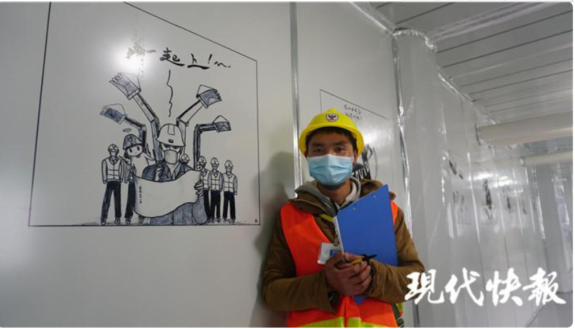 許新焰表示,他進入病區搶修線路時,他看到A2病區的護士在墻壁上畫了很多漫畫,從小就喜歡畫畫的他,頓時技癢難耐。" 剛開始還不敢畫,怕領導說我不務正業,偷偷地在電井里畫了工人維修水電的畫面。" 領導看到電井里的卡通畫后,主動找到許新焰,鼓勵他再畫一些能夠鼓舞斗志的漫畫。