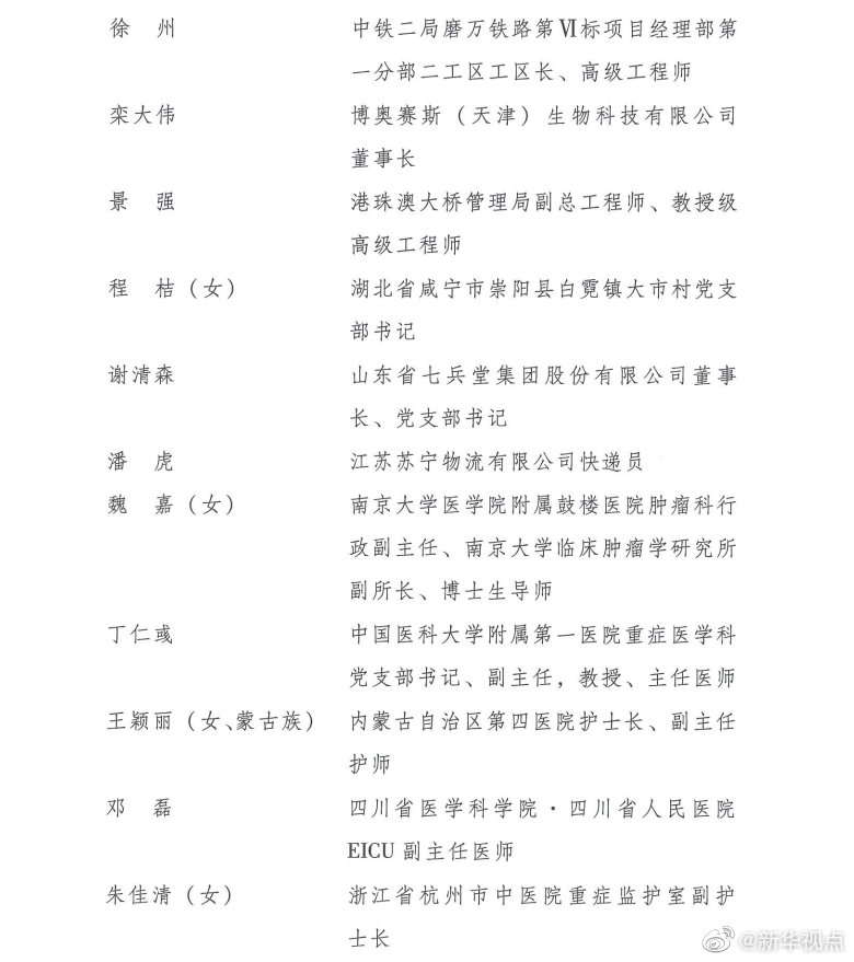 榮獲第24屆“中國(guó)青年五四獎(jiǎng)?wù)隆钡姆謩e是:江蘇省南京市鼓樓區(qū)方家營(yíng)消防救援站站長(zhǎng)助理、三級(jí)消防長(zhǎng)丁良浩,安徽省滁州市定遠(yuǎn)縣吳圩鎮(zhèn)西孔村黨總支第一書(shū)記王萌萌(女),廈門(mén)大學(xué)航空航天學(xué)院常務(wù)副院長(zhǎng)、特聘教授、博士生導(dǎo)師尤延鋮,湖北省黃岡市羅田縣希望小學(xué)校長(zhǎng)方榮(女),浙江每日互動(dòng)網(wǎng)絡(luò)科技股份有限公司董事長(zhǎng)兼總經(jīng)理、黨委書(shū)記方毅,浙江省杭州市拱墅區(qū)職業(yè)高級(jí)中學(xué)美發(fā)專(zhuān)業(yè)教師石丹(女),國(guó)家超級(jí)計(jì)算無(wú)錫中心副主任付昊桓,中國(guó)石油大港油田公司第二采油廠作業(yè)二區(qū)注采二組副組長(zhǎng)馮萌萌(女),寧夏回族自治區(qū)石嘴山市中醫(yī)醫(yī)院副主任醫(yī)師朱斌,中國(guó)國(guó)家女子排球隊(duì)隊(duì)員、隊(duì)長(zhǎng)朱婷(女),95072部隊(duì)參謀部訓(xùn)練處正團(tuán)職飛行技術(shù)檢查主任劉飛,廣西壯族自治區(qū)玉林市博白縣桂源農(nóng)牧有限公司總經(jīng)理劉入源,貴州省黔西南州望謨縣實(shí)驗(yàn)高中黨總支副書(shū)記、副校長(zhǎng)劉秀祥,哈爾濱工業(yè)大學(xué)體育部副教授張虹(女),遼寧省沈陽(yáng)造幣有限公司鉗工高級(jí)技師、維修班班長(zhǎng)張文良(滿族),北京市朝陽(yáng)區(qū)青少年指導(dǎo)服務(wù)中心主任張曉菲(女),吉林省超凡夢(mèng)想公益基金會(huì)理事長(zhǎng)張超凡(女),中國(guó)科學(xué)院計(jì)算技術(shù)研究所所長(zhǎng)助理、研究員、博士生導(dǎo)師陳云霽,武警部隊(duì)某部特戰(zhàn)訓(xùn)練大隊(duì)代理大隊(duì)長(zhǎng)陳玉浩,中山大學(xué)中山眼科中心副主任、研究員林浩添,四川省廣元市青川縣恒豐食用菌種植專(zhuān)業(yè)合作社理事長(zhǎng)、青川海伶山珍商貿(mào)有限責(zé)任公司總經(jīng)理趙海伶(女),航空工業(yè)哈爾濱飛機(jī)工業(yè)集團(tuán)有限公司數(shù)控銑工秦世俊,92950部隊(duì)飛行一大隊(duì)大隊(duì)長(zhǎng)袁偉,中鐵二局磨萬(wàn)鐵路第Ⅵ標(biāo)項(xiàng)目經(jīng)理部第一分部二工區(qū)工區(qū)長(zhǎng)、高級(jí)工程師徐州,博奧賽斯(天津)生物科技有限公司董事長(zhǎng)欒大偉,港珠澳大橋管理局副總工程師、教授級(jí)高級(jí)工程師景強(qiáng),湖北省咸寧市崇陽(yáng)縣白霓鎮(zhèn)大市村黨支部書(shū)記程桔(女),山東省七兵堂集團(tuán)股份有限公司董事長(zhǎng)、黨支部書(shū)記謝清森,江蘇蘇寧物流有限公司快遞員潘虎,南京大學(xué)醫(yī)學(xué)院附屬鼓樓醫(yī)院腫瘤科行政副主任、南京大學(xué)臨床腫瘤學(xué)研究所副所長(zhǎng)、博士生導(dǎo)師魏嘉(女),中國(guó)醫(yī)科大學(xué)附屬第一醫(yī)院重癥醫(yī)學(xué)科黨支部書(shū)記、副主任,教授、主任醫(yī)師丁仁彧,內(nèi)蒙古自治區(qū)第四醫(yī)院護(hù)士長(zhǎng)、副主任護(hù)師王穎麗(女、蒙古族),四川省醫(yī)學(xué)科學(xué)院·四川省人民醫(yī)院EICU副主任醫(yī)師鄧?yán)?,浙江省杭州市中醫(yī)院重癥監(jiān)護(hù)室副護(hù)士長(zhǎng)朱佳清(女),江蘇康為世紀(jì)生物科技有限公司總經(jīng)理、黨支部書(shū)記莊志華(女),首都醫(yī)科大學(xué)附屬北京友誼醫(yī)院重癥醫(yī)學(xué)科主任助理、副主任醫(yī)師劉壯,中建深圳裝飾有限公司項(xiàng)目經(jīng)理劉鋮,重慶醫(yī)科大學(xué)附屬第一醫(yī)院呼吸與危重癥醫(yī)學(xué)科副主任醫(yī)師、副教授劉煜亮,青海省人民醫(yī)院重癥醫(yī)學(xué)科護(hù)士長(zhǎng)、主管護(hù)師孫曉林(女),湖北省武漢市漢陽(yáng)區(qū)龍陽(yáng)街芳草社區(qū)黨支部書(shū)記、居委會(huì)主任杜云(女),福建省疾病預(yù)防控制中心免疫規(guī)劃所主管技師李東,中國(guó)鐵路南昌局集團(tuán)有限公司南昌疾病預(yù)防控制所消殺科科長(zhǎng)楊波,河北中醫(yī)學(xué)院第一附屬醫(yī)院(河北省中醫(yī)院)護(hù)師肖思孟(女、滿族),北京協(xié)和醫(yī)學(xué)院教授、中國(guó)醫(yī)學(xué)科學(xué)院腫瘤醫(yī)院研究員吳晨(女),中國(guó)寶武武漢武鋼綠色城市技術(shù)發(fā)展有限公司海綿公司工程技術(shù)部部長(zhǎng)何航,湖北順豐速運(yùn)有限公司分部經(jīng)理汪勇,天津醫(yī)科大學(xué)總醫(yī)院呼吸與危重癥醫(yī)學(xué)科監(jiān)護(hù)室護(hù)士長(zhǎng)沈悅好(女),西安交通大學(xué)第二附屬醫(yī)院急診科副主任、副主任醫(yī)師張正良,青島大學(xué)附屬醫(yī)院麻醉科主治醫(yī)師張孝田,湖南省湘潭市第一人民醫(yī)院重癥醫(yī)學(xué)科主任、副主任醫(yī)師易釗泉,湖南省懷化市志愿者協(xié)會(huì)副秘書(shū)長(zhǎng)羅小小,華中科技大學(xué)同濟(jì)醫(yī)學(xué)院附屬同濟(jì)醫(yī)院心內(nèi)科副教授、副主任醫(yī)師周寧,甘肅藍(lán)天救援隊(duì)理事長(zhǎng)、隊(duì)長(zhǎng)於若飛,武漢大學(xué)中南醫(yī)院感染科護(hù)士長(zhǎng)、主管護(hù)師胡慧(女),遼寧省沈陽(yáng)橡膠研究設(shè)計(jì)院有限公司研發(fā)中心基礎(chǔ)理論與材料研究主任工程師姚秀超,山西醫(yī)科大學(xué)第一醫(yī)院神經(jīng)內(nèi)科護(hù)士長(zhǎng)、主管護(hù)師唐珊(女),湖北省武漢市公安