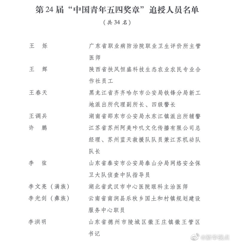 第24屆“中國(guó)青年五四獎(jiǎng)?wù)隆弊肥谌藛T分別是:廣東省職業(yè)病防治院職業(yè)衛(wèi)生評(píng)價(jià)所主管醫(yī)師王爍,陜西省扶風(fēng)恒盛科技生態(tài)農(nóng)業(yè)農(nóng)民專(zhuān)業(yè)合作社員工王輝,黑龍江省齊齊哈爾市公安局鐵鋒分局新工地派出所代理副所長(zhǎng)、四級(jí)警長(zhǎng)王春天,湖南省邵東市公安局水東江鎮(zhèn)派出所輔警王調(diào)兵,江蘇省蘇州阿美咔嘰文化傳播有限公司總經(jīng)理、蘇州藍(lán)天救援隊(duì)隊(duì)員兼江蘇機(jī)動(dòng)隊(duì)隊(duì)長(zhǎng)許鵬,山東省泰安市公安局泰山分局網(wǎng)絡(luò)安全保衛(wèi)大隊(duì)偵查中隊(duì)指導(dǎo)員李弦,湖北省武漢市中心醫(yī)院眼科主治醫(yī)師李文亮(滿族),云南省南澗縣樂(lè)秋鄉(xiāng)國(guó)土和村鎮(zhèn)規(guī)劃建設(shè)服務(wù)中心職員李光劍(彝族),山東省德州市陵城區(qū)徽王莊鎮(zhèn)徽王管區(qū)書(shū)記李洪明,內(nèi)蒙古自治區(qū)根河市公安局阿龍山鎮(zhèn)派出所輔警李曉歡,江蘇省徐州市銅山區(qū)公安局巡特警大隊(duì)輔警時(shí)席席,浙江省國(guó)際貿(mào)易集團(tuán)浙江英特醫(yī)療器械公司維修工程師何旭峰,江蘇省太倉(cāng)市公安局瀏河派出所三級(jí)警長(zhǎng)位洪明,湖北省宜昌市秭歸縣沙鎮(zhèn)溪鎮(zhèn)高潮村黨總支書(shū)記、村委會(huì)主任、民兵連指導(dǎo)員宋青山,湖南省衡山縣東湖鎮(zhèn)馬跡衛(wèi)生院藥劑組副組長(zhǎng)宋英杰,四川省紅原縣森林公安局刷經(jīng)寺派出所所長(zhǎng)阿真能周(藏族),河南省駐馬店市泌陽(yáng)縣衛(wèi)生監(jiān)督所監(jiān)督員陳申,云南省昭通市彝良縣奎香鄉(xiāng)寸田村衛(wèi)生室醫(yī)生陳?。ㄅ?,江西省萍鄉(xiāng)市蘆溪縣銀河鎮(zhèn)長(zhǎng)竹村衛(wèi)生計(jì)生服務(wù)室醫(yī)生陳祥田,中國(guó)南方電網(wǎng)云南電網(wǎng)有限責(zé)任公司昆明供電局正值調(diào)度員林芳雯(女、彝族),湖北省武漢特瑞利新材料有限公司出納周友芳(女),安徽省銅陵市樅陽(yáng)縣公安局特(巡)警大隊(duì)輔警一中隊(duì)副隊(duì)長(zhǎng)胡鋒,四川省甘孜藏族自治州得榮縣龍絨寺寺廟管理委員會(huì)主任洛絨益西(藏族),四川省廣元經(jīng)開(kāi)區(qū)盤(pán)龍鎮(zhèn)深溝村村民宮高明,江蘇省南京市公安局高淳分局淳溪派出所輔警袁劍雄,山東省泰安市岱岳區(qū)角峪鎮(zhèn)先鋒村村民賈慶臣,湖北省武漢市蔡甸區(qū)人民醫(yī)院住院醫(yī)師夏思思(女),江蘇省南京市公安局行政審批服務(wù)處網(wǎng)絡(luò)政務(wù)科一級(jí)警員徐昊,江蘇省徐州市沛縣公安局五段派出所輔警章良志,湖北省武漢市江夏區(qū)第一人民醫(yī)院醫(yī)師彭銀華,廣東省英德市公安局橋頭派出所輔警曾文聰,江西省蓮花縣湖上鄉(xiāng)中心衛(wèi)生院醫(yī)生熊波,河南省鄭州市公安局東風(fēng)路分局治安管理服務(wù)大隊(duì)三中隊(duì)民警、四級(jí)警長(zhǎng)樊樹(shù)鋒,甘肅省舟曲縣扶貧辦副主任張小娟(女、藏族)。