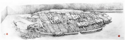 早期的考古現場都會采用帶有透視方法的素描速寫方法進行現場記錄。半坡遺址、廣州南越王墓考古現場都曾專門請畫家到現場繪制素描圖。此圖繪制于2015年12月。作為現場發掘的參與者,作者負責現場測繪和畫圖的工作,每天都留意著沉船隨著發掘進度而產生的變化。