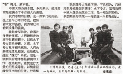 1990年定海水下考古培訓時,記者(照片左二)也曾下水,設法近距離觀察遺址狀況和隊員們的工作。崔勇(照片右一)是記者在水下的守護人之一。人民日報海外版也是最早詳細報道中國水下考古事業發展的新聞媒體。 (本報資料照片)