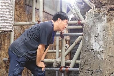 這張照片拍攝于2020年4月26日。考古隊員拍到了他們領隊崔勇做現場評估的場景。在沉船的外圍,已經進展到發掘外側反斜面位置,此時支護要預防船向下和向外的移位。支架太疏帶來風險,太密則會影響發掘。 鄧嘉韶攝