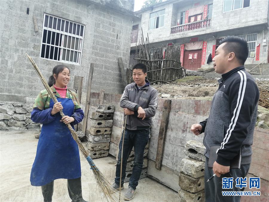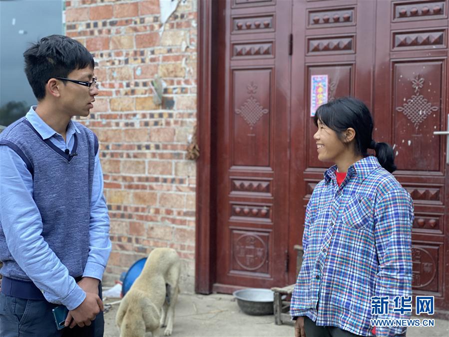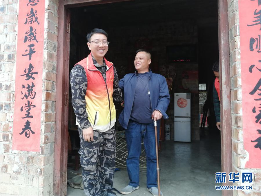 結束入戶調查后,廣西田林縣八渡瑤族鄉六林村駐村第一書記牟海迪(左)與貧困戶告別(4月24日攝)。 新華社記者 王軍偉 攝