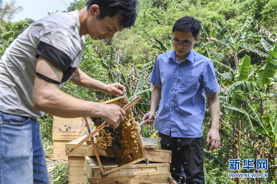 廣西樂業縣新化鎮百坭村扶貧工作隊員譚天社(右)與村民班華六在查看蜂巢(4月20日攝)。 新華社記者 曹祎銘 攝