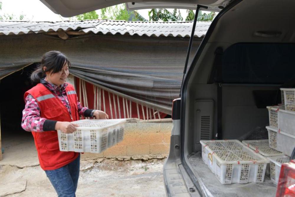 廣西百色市德保縣敬德鎮(zhèn)馱信村駐村第一書記李梅在裝運即將出售的鵪鶉蛋(資料照片)。新華社發(fā)