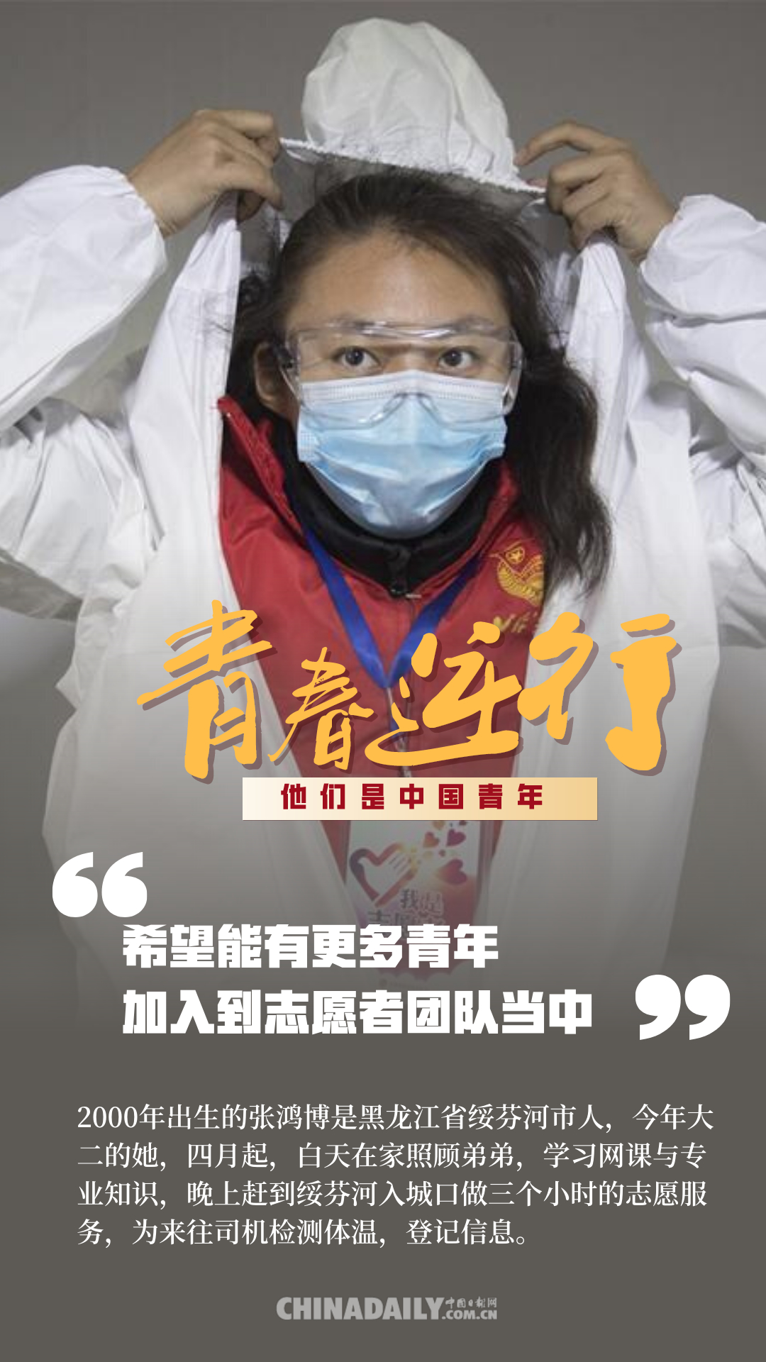 百年前,中國青年用春春和熱血,為祖國的前途命運(yùn)而抗?fàn)?;百年后,中國青年秉承先輩精神,沖鋒在保衛(wèi)人民健康安全的戰(zhàn)疫前線。危機(jī)之時(shí),他們總是挺身而出,主動(dòng)申請(qǐng)到國家和人民最需要的地方去。在這場(chǎng)疫情防控阻擊戰(zhàn)中,4.2萬多名援鄂醫(yī)護(hù)人員里有1.2萬多名“90后”,還有一部分是“95后”“00后”,此外,在基建工人、公安干警、志愿者、網(wǎng)格員等抗“疫”隊(duì)伍里也有許多年輕的面孔,他們?cè)谝咔榉揽刂猩嵘馈⒂y而上,為我們筑起了一道道鋼鐵長(zhǎng)城。這些人是當(dāng)代中國青年的縮影,他們用行動(dòng)證明,中國青年是堪當(dāng)大任的!