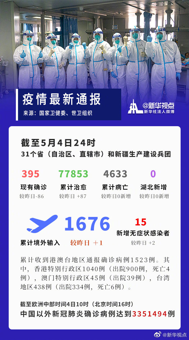 截至5月4日24時,據(jù)31個省(自治區(qū)、直轄市)和新疆生產(chǎn)建設(shè)兵團報告,現(xiàn)有確診病例395例(其中重癥病例29例),累計治愈出院病例77853例,累計死亡病例4633例,累計報告確診病例82881例,現(xiàn)有疑似病例2例。累計追蹤到密切接觸者735240人,尚在醫(yī)學觀察的密切接觸者7152人。