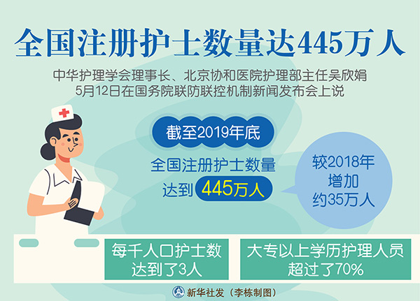 新華社北京5月12日電(記者王優玲、王秉陽)中華護理學會理事長、北京協和醫院護理部主任吳欣娟12日在國務院聯防聯控機制新聞發布會上說,截至2019年底,全國注冊護士數量達到445萬人,較2018年增加約35萬人。每千人口護士數達到了3人,大專以上學歷護理人員超過了70%。