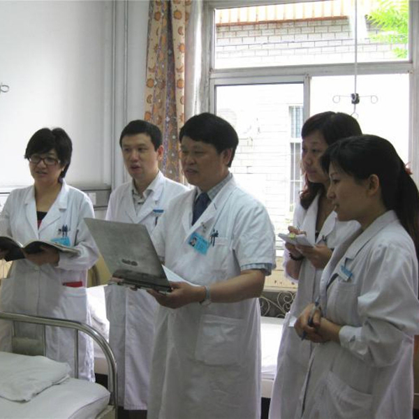 中國醫(yī)學(xué)科學(xué)院腫瘤醫(yī)院徐兵河教授(右三)、馬飛教授(右四)攜治療團隊在病房查問病人康復(fù)情況。(圖片由受訪者提供)