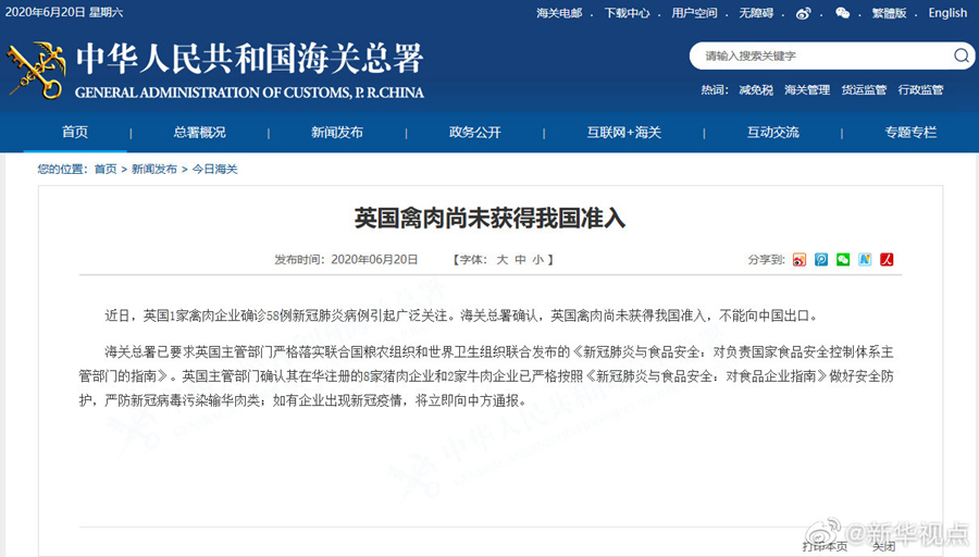 海關(guān)總署20日發(fā)布公告說(shuō),近日英國(guó)一家禽肉企業(yè)確診58例新冠肺炎病例引起廣泛關(guān)注。海關(guān)總署確認(rèn),英國(guó)禽肉尚未獲得我國(guó)準(zhǔn)入,不能向中國(guó)出口。海關(guān)總署已要求英國(guó)主管部門嚴(yán)格落實(shí)聯(lián)合國(guó)糧農(nóng)組織和世界衛(wèi)生組織聯(lián)合發(fā)布的《新冠肺炎與食品安全:對(duì)負(fù)責(zé)國(guó)家食品安全控制體系主管部門的指南》。英國(guó)主管部門確認(rèn)其在華注冊(cè)的8家豬肉企業(yè)和2家牛肉企業(yè)已嚴(yán)格按照《新冠肺炎與食品安全:對(duì)食品企業(yè)指南》做好安全防護(hù),嚴(yán)防新冠病毒污染輸華肉類;如有企業(yè)出現(xiàn)新冠疫情,將立即向中方通報(bào)。(記者劉紅霞)